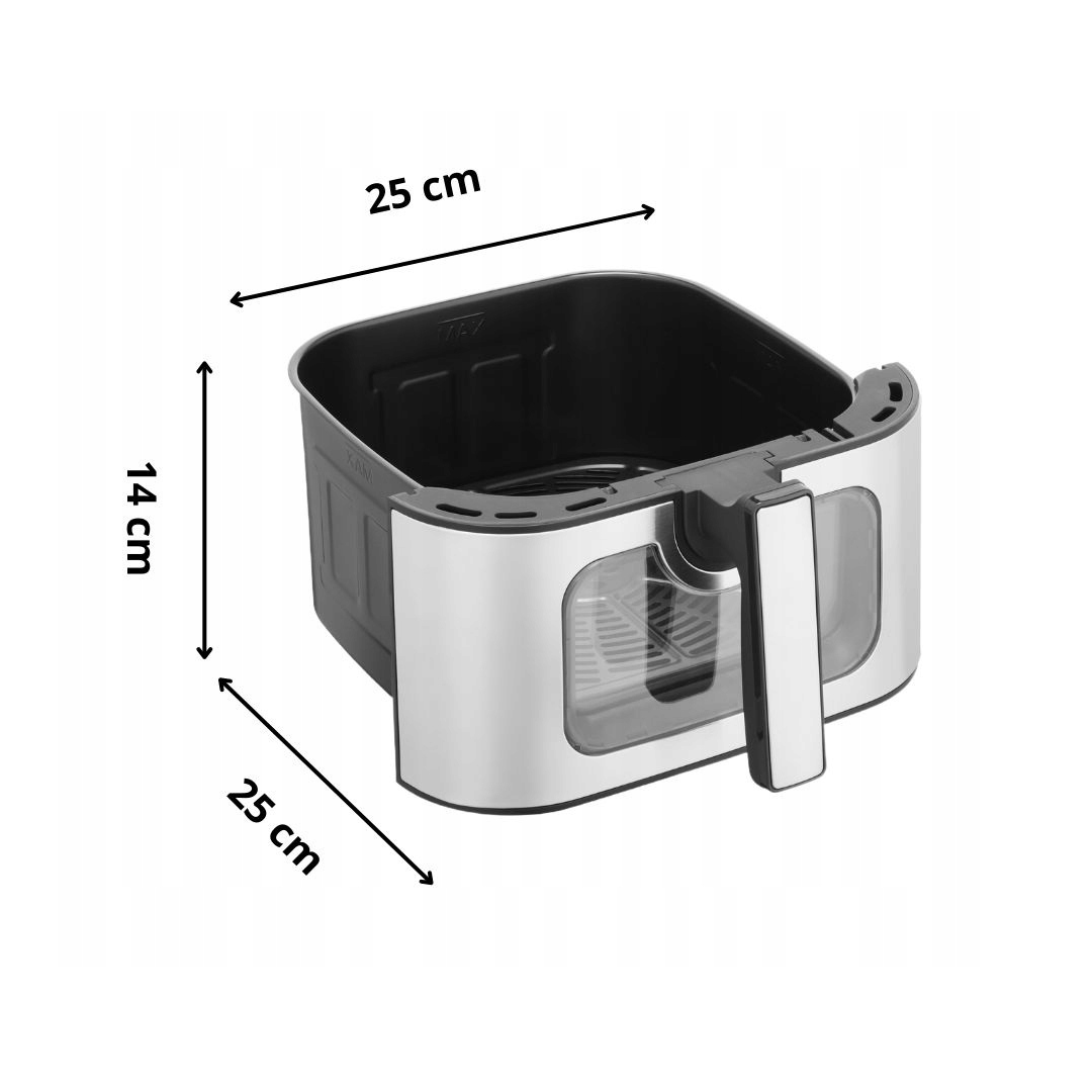 Kompaktowa forma (34 × 29 × 34 cm) idzie w parze z dużą pojemnością misy (25 × 25 × 14 cm), dzięki czemu Air Fryer nie zajmuje zbyt wiele miejsca na blacie, a jednocześnie z łatwością pomieści wszystko, czego potrzebujesz na rodzinny obiad czy domową ucztę dla znajomych. Solidna konstrukcja, przemyślane detale i ergonomiczna budowa to gwarancja wygody i trwałości na lata.